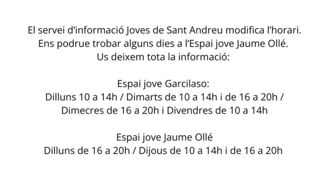 A partir d’aquesta setmana trobareu el servei de Joves de Sant Andreu a l’espai jove Jaume Ollé uns dies a la setmana. Aquest canvi té per objectiu facilitar l’accés al servei a totes a les joves del districte apostant per una descentralització…