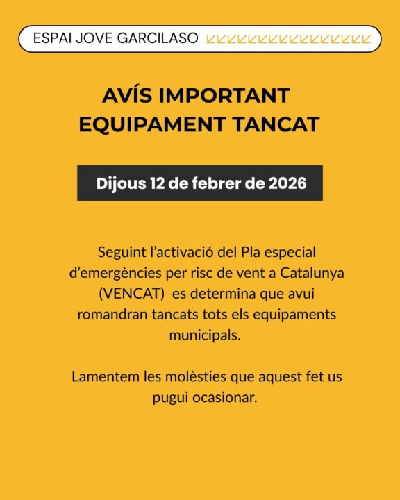 AVÍS TANCAMENT DEL CENTRE Publicat el 11 de febrer de 202611 de febrer de 2026 per Garcilaso Web Seguint l’activació del Pla especial d’emergències per risc de vent a Catalunya (VENCAT) es determina que avui 12 de Febrer de 2026 romandran tancats tots els equipaments municipals. Lamentem les molèsties que aquest fet us pugui ocasionar.