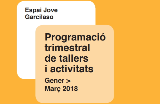 Aquí tens la nova programació trimestral dels tallers que realitzem de gener a març a l’Espai Jove Garcilaso. Et pots inscriure en els tallers via online i també descarregar-te el díptic.