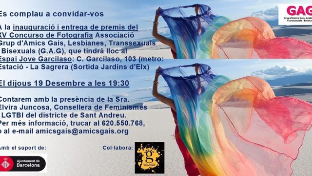 Ens complau convidar-vos a la inauguració i lliurament de premis de la XV edició del Concurs de Fotografia de L’Associació Grup, d’Amics Gais, Lesbianes, Transsexuals i Bisexuals (GAG) A l’Espai Jove Garcilaso, Carrer Garcilaso, 103