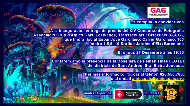 Ens complau convidar-vos a la inauguració i entrega de premis del XIV Concurs de Fotografia Associació Grup d’Amics Gais, Lesbianes, Transexuals i Bisexuals (G.A.G), que tindrà lloc a l’Espai Jove Garcilaso: Carrer Garcilaso, 103 (metro 1, 5, 9 i…